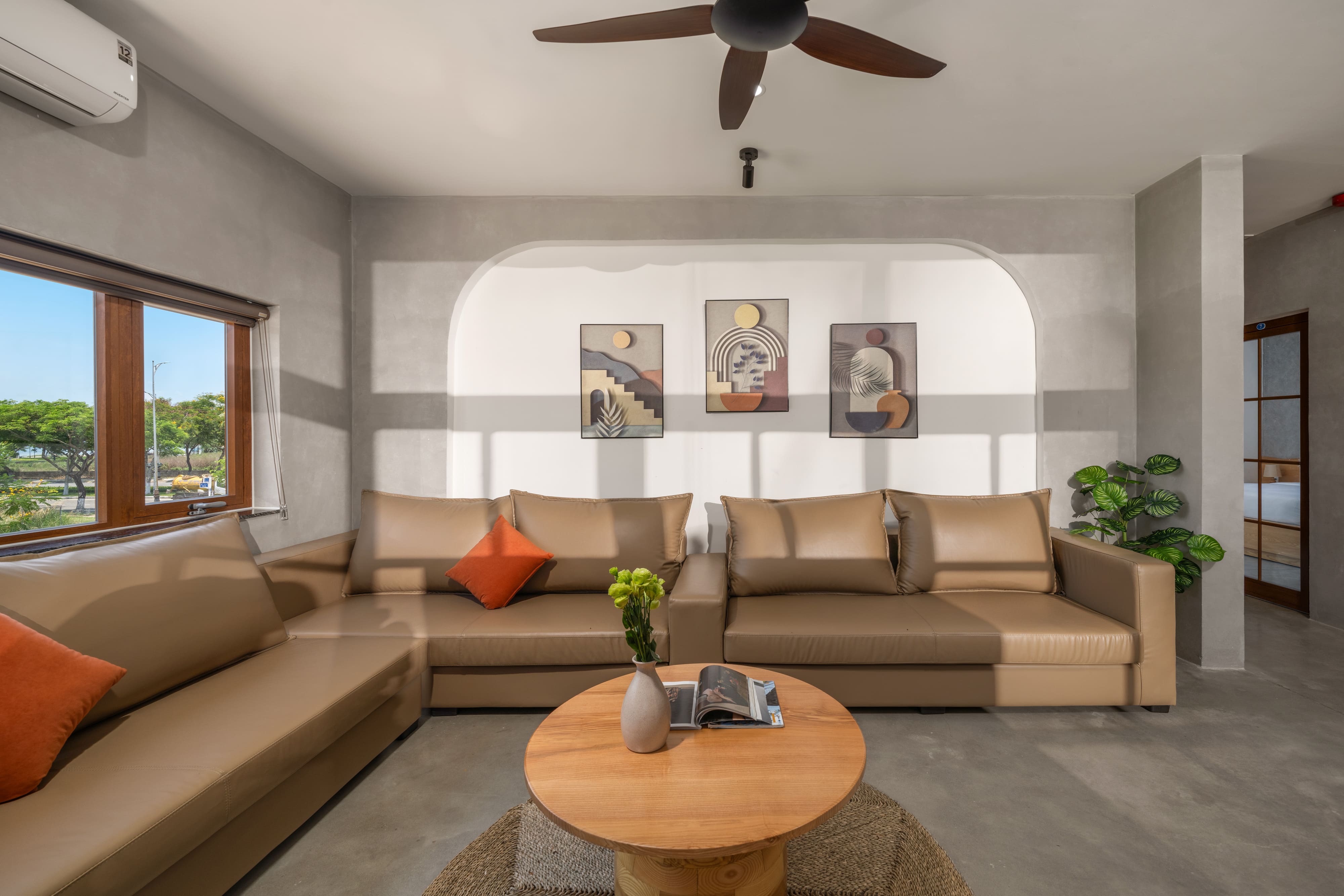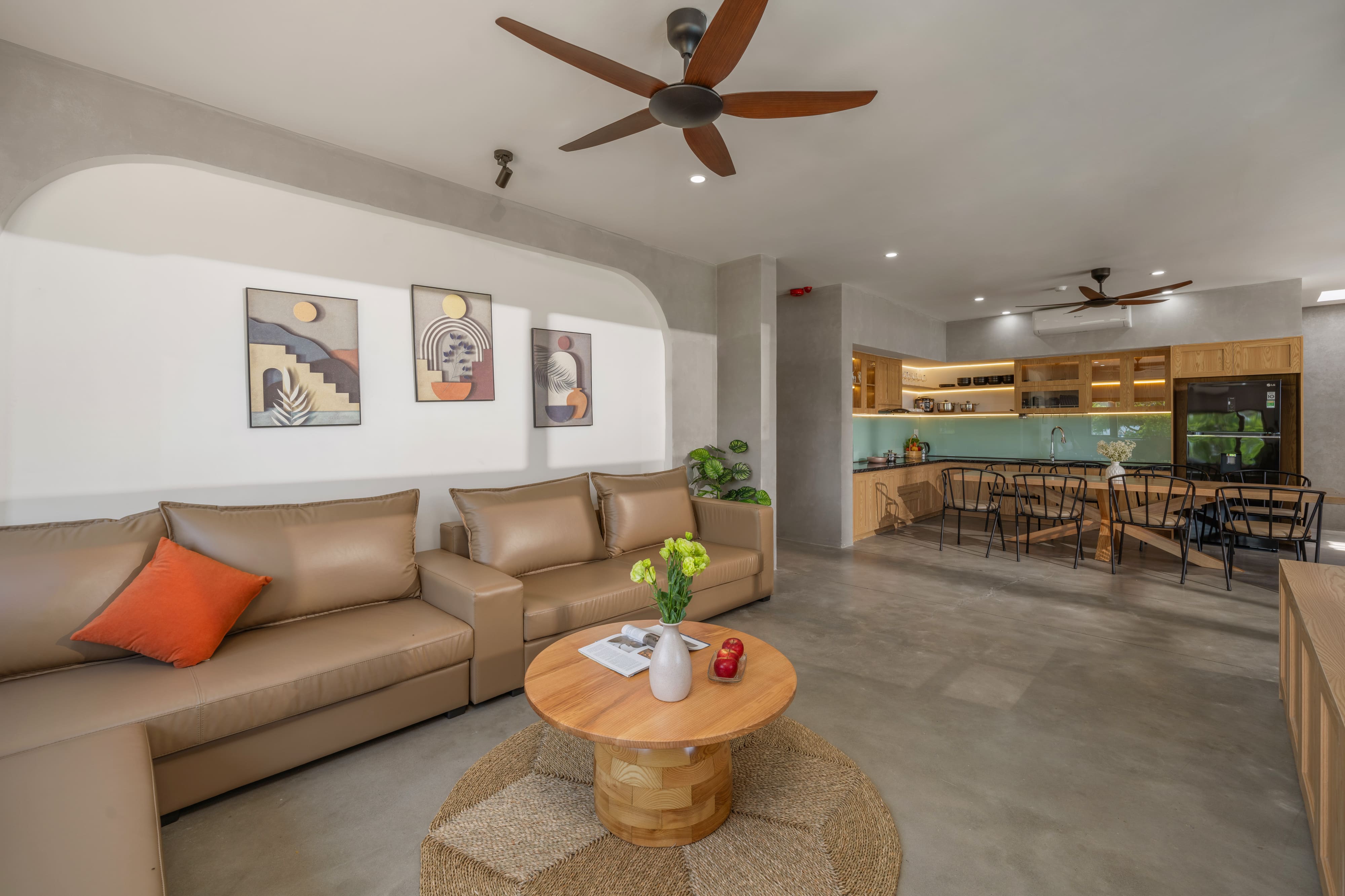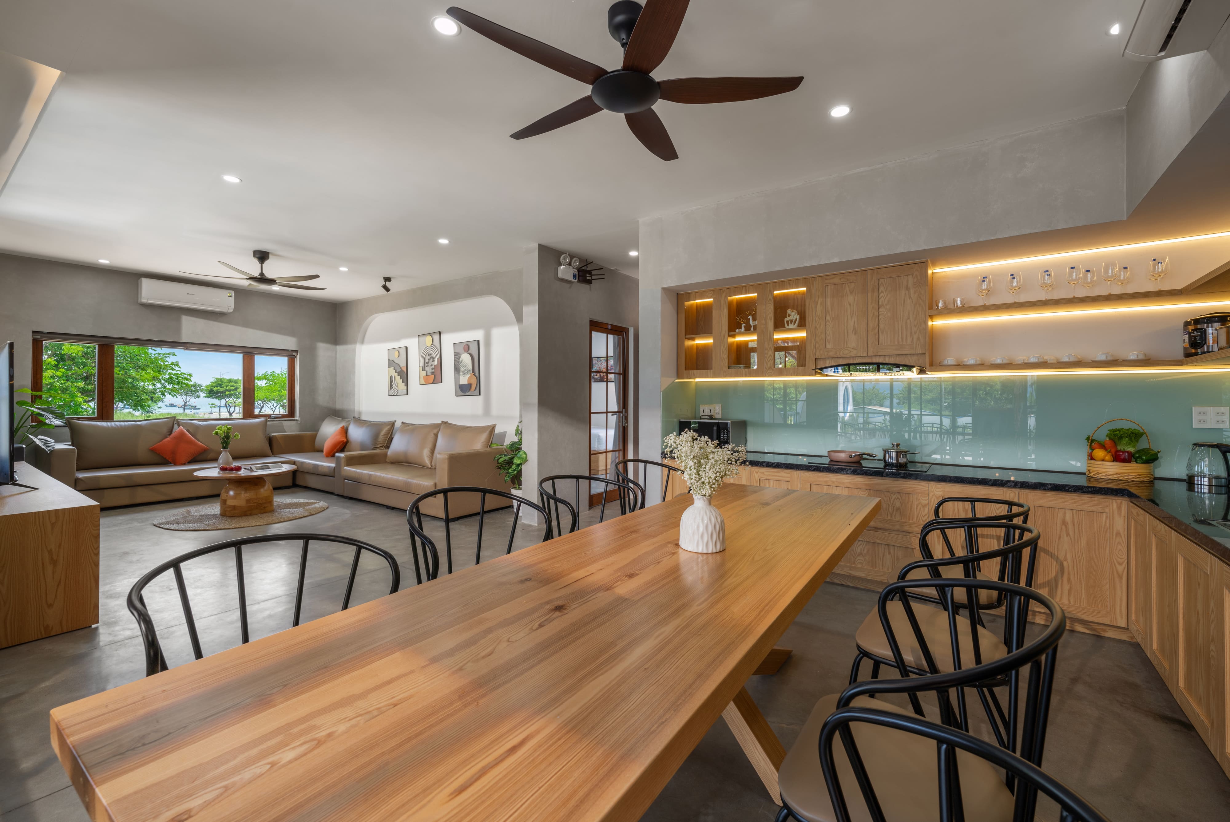 Phòng khách thiết kế mở, tràn ngập ánh sáng tự nhiên – nơi cả nhóm có thể cùng nhau chuyện trò, ăn uống và chill bên ly rượu vang.