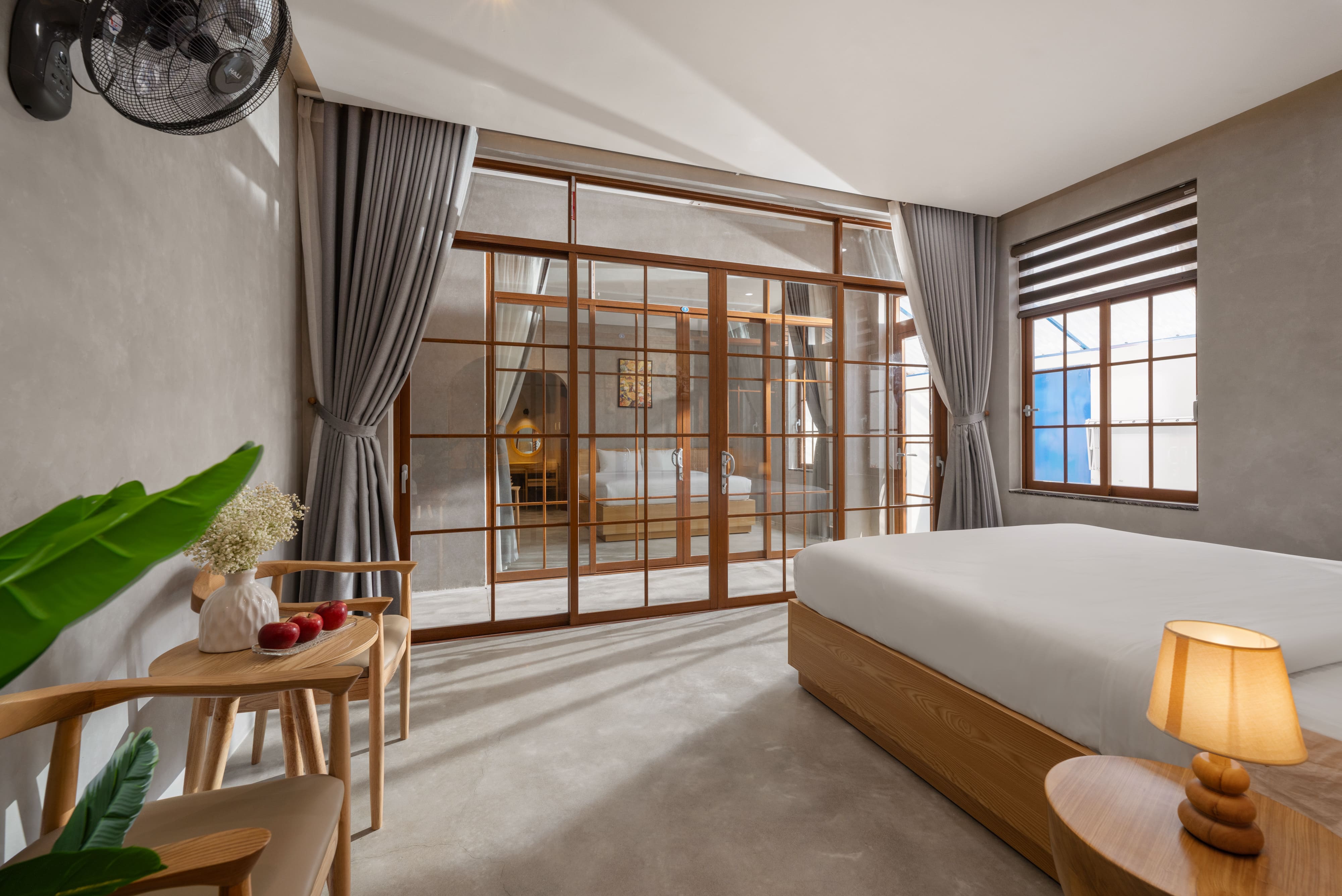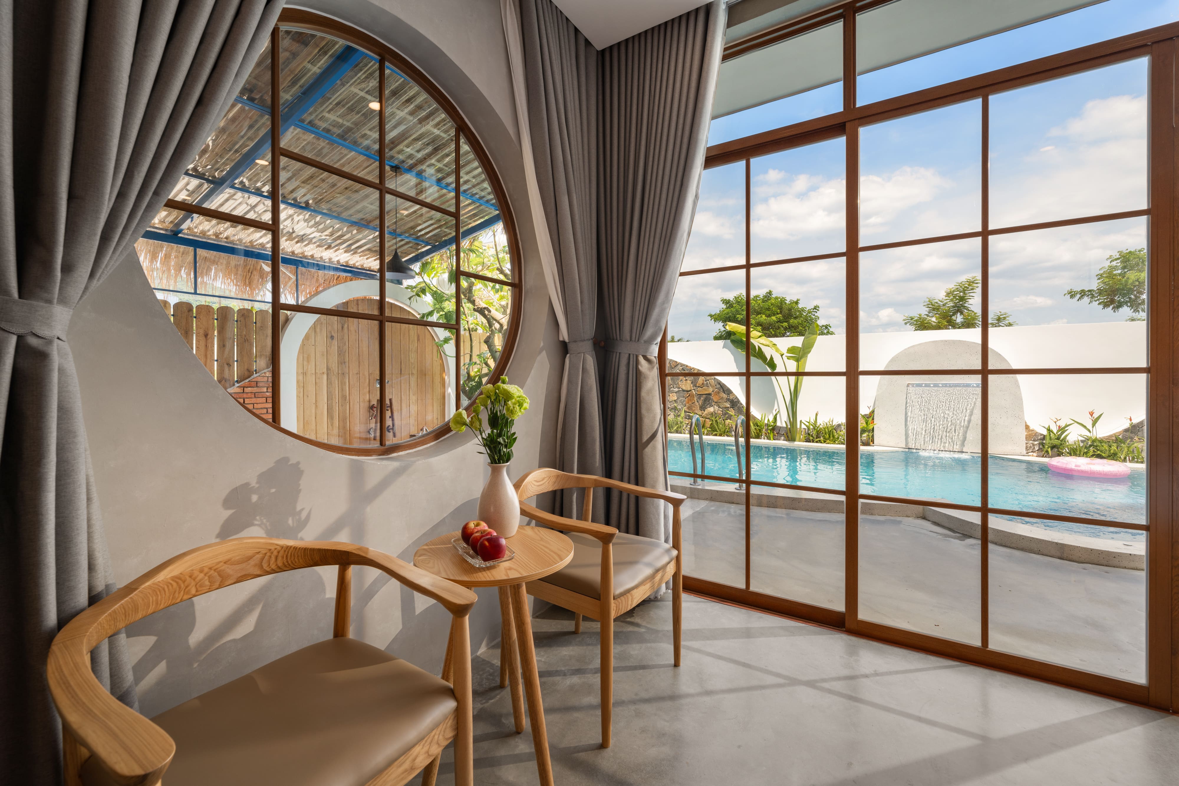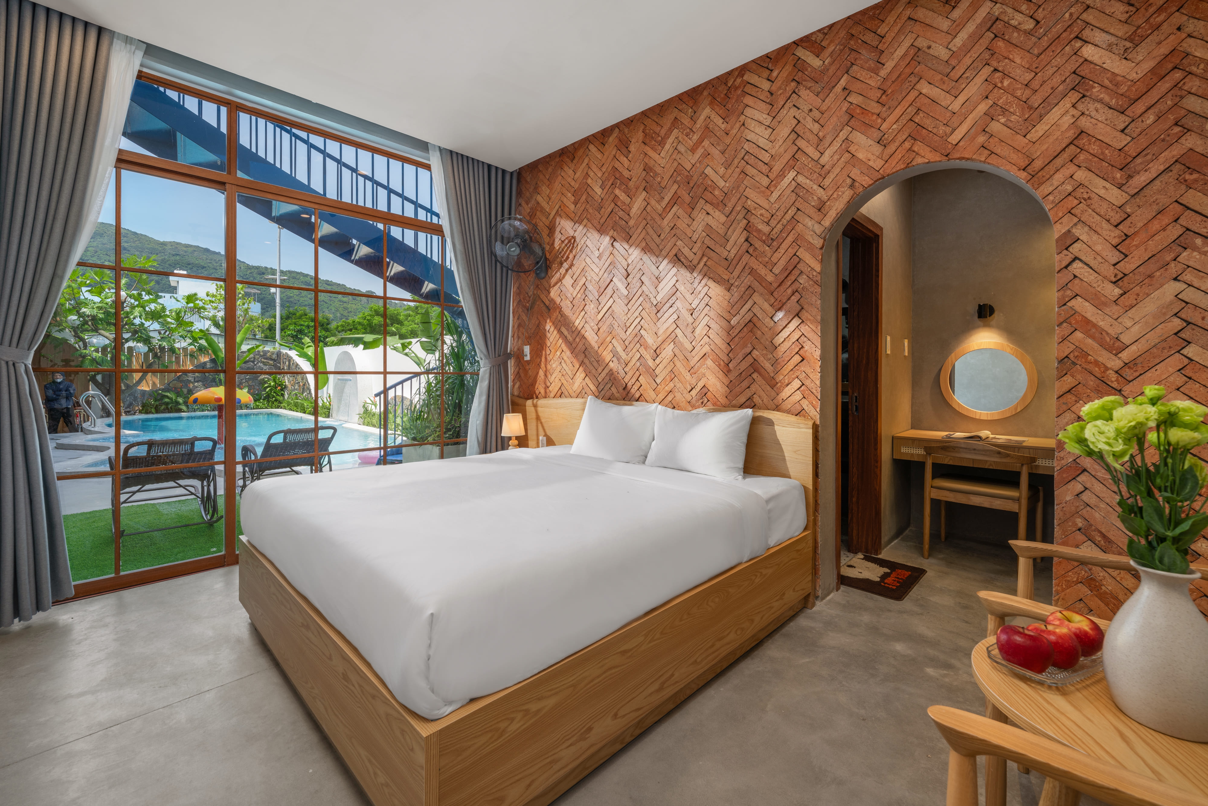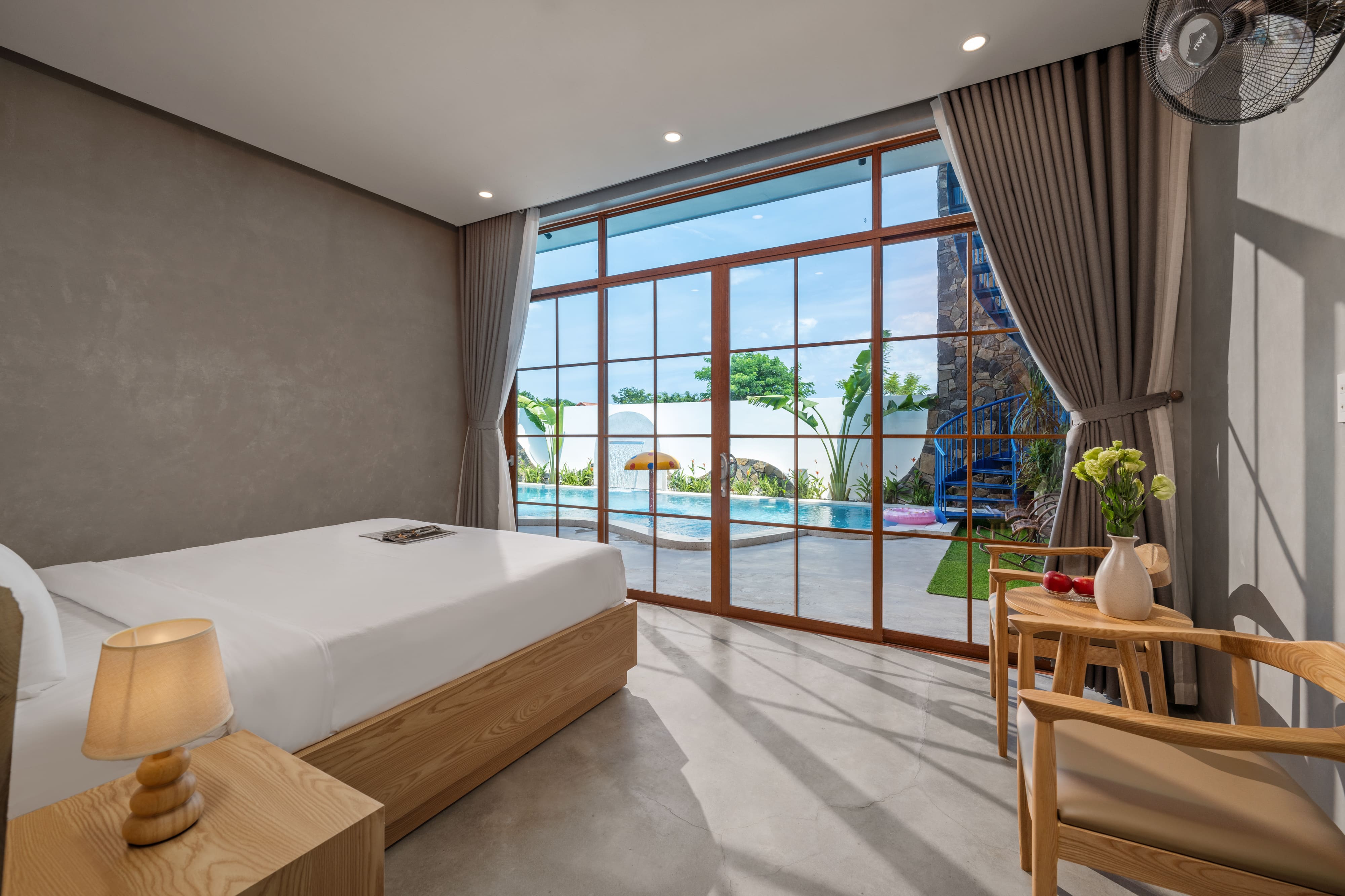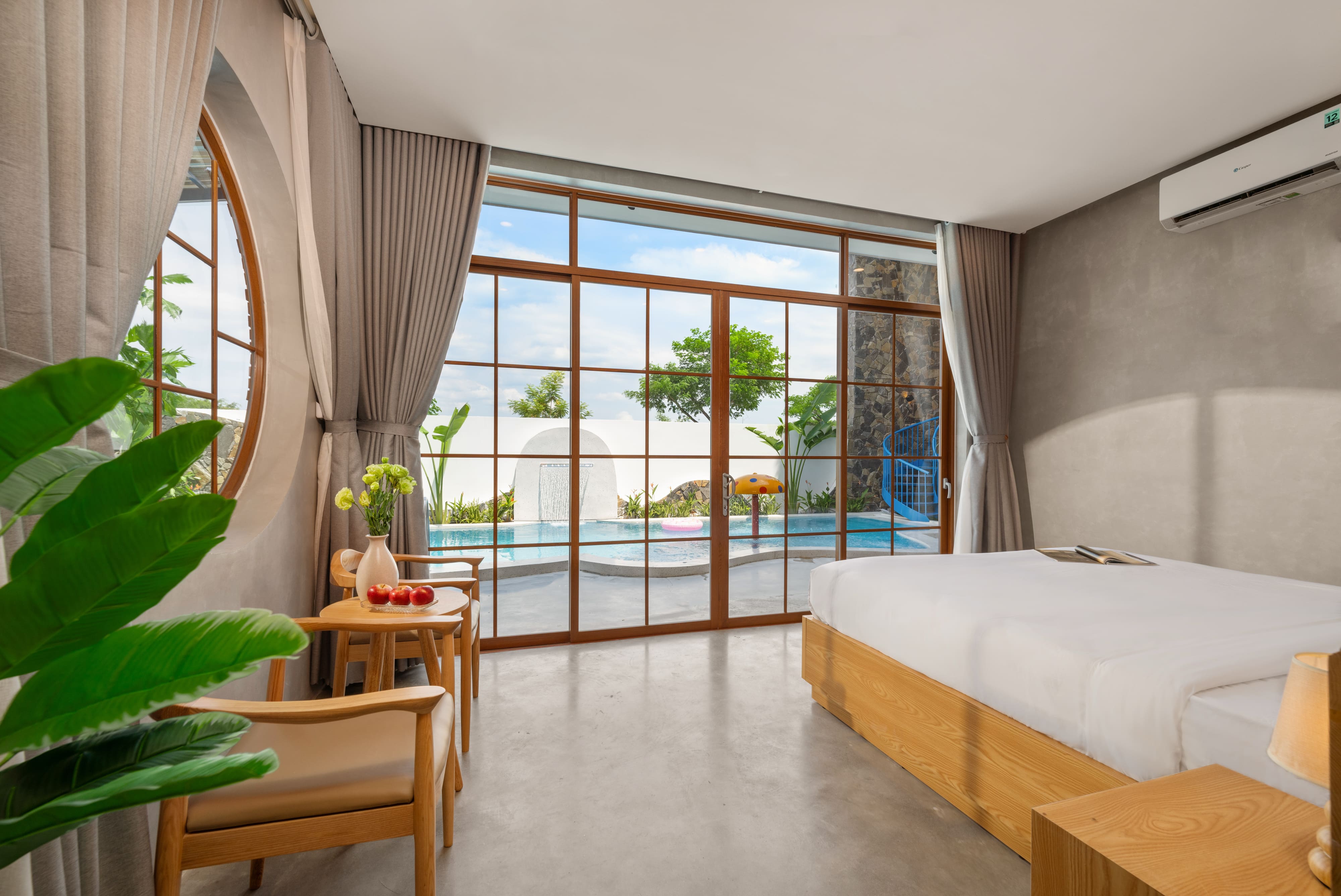 Toàn bộ villa có nhiều phòng ngủ khép kín, mỗi phòng đều có ban công đón nắng, cửa sổ lớn mở ra khung cảnh vườn xanh hoặc hồ bơi.